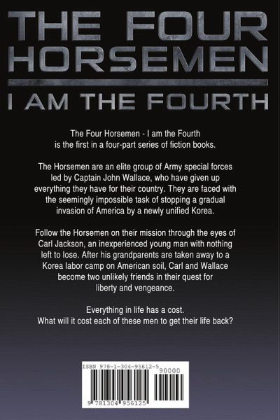 The Four Horsemen: I am the Fourth is the first book in a four part series of fiction books. The Horsemen are an elite group of Army special forces led by Captain John Wallace, who have given up everything they have for their country. They are faced with the seemingly impossible task of stopping a gradual invasion of America by a newly unified Korea. Follow the Horsemen on their mission through the eyes of Carl Jackson, an inexperienced young man with nothing left to lose. After his grandparents are taken away to a Korean labor camp on American soil, Carl and Wallace become two unlikely friends in their quest for liberty and vengeance. Everything in life has a cost; what will it cost each of these men to get their life back?