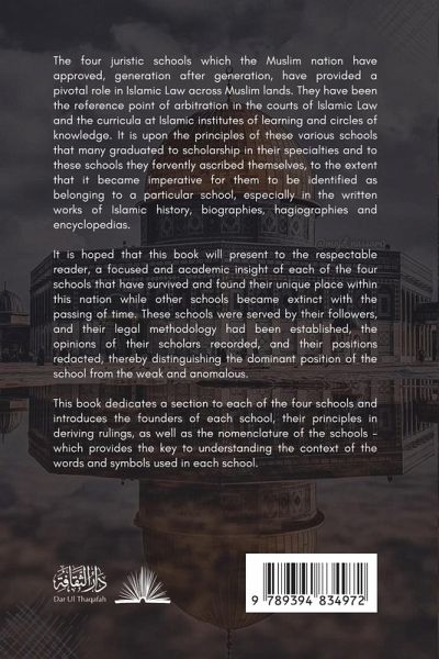 The four juristic schools which the Muslim nation has approved, generation after generation, have provided a pivotal role in Islamic Law across Muslim lands. They have been the reference point of arbitration in the courts of Islamic Law and the curricula at Islamic institutes of learning and circles of knowledge. It is upon the principles of these various schools that many graduated to scholarship in their specialties, and to these schools, they fervently ascribed themselves, to the extent that it became imperative for them to be identified as belonging to a particular school, especially in the written works of Islamic history, biographies, hagiographies and encyclopedias. It is hoped that this book will present to the respectable reader, a focused and academic insight of each of the four schools that have survived and found their unique place within this nation while other schools became extinct with the passing of time. These schools were served by their followers, and their legal methodology had been established, the opinions of their scholars recorded, and their positions redacted, thereby distinguishing the dominant position of the school from the weak and anomalous. This book dedicates a section to each of the four schools and introduces the founders of each school, their principles in deriving rulings, as well as the nomenclature of the schools - which provides the key to understanding the context of the words and symbols used in each school.