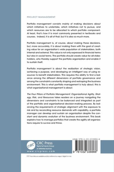 The Four Pillars of Portfolio Management: Organizational Agility, Strategy, Risk, and Resources takes readers on a journey navigating the dimensions and constraints to be balanced and integrated as part of the portfolio and organizational decision-making process. By balancing the requirements of strategic alignment with the exposure to risk and by reconciling resource demands with capability, a portfolio manager can develop and sustain an organization despite the constant and dynamic evolution of the business environment. This book explains how to manage portfolios that create the agility all organizations require to survive and thrive.