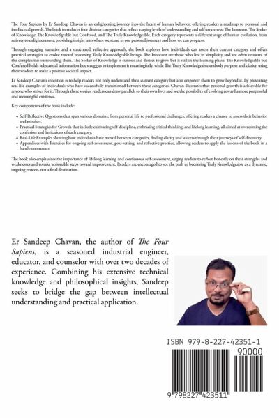 The Four Sapiens by Er Sandeep Chavan is an enlightening journey into the heart of human behavior, offering readers a roadmap to personal and intellectual growth. The book introduces four distinct categories that reflect varying levels of understanding and self-awareness: The Innocent, The Seeker of Knowledge, The Knowledgeable but Confused, and The Truly Knowledgeable. Each category represents a different stage of human evolution, from naivety to enlightenment, providing insight into where we stand in our personal journeys and how we can progress. Through engaging narrative and a structured, reflective approach, the book explores how individuals can assess their current category and offers practical strategies to evolve toward becoming Truly Knowledgeable beings. The Innocent are those who live in simplicity and are often unaware of the complexities surrounding them. The Seeker of Knowledge is curious and desires to grow but is still in the learning phase. The Knowledgeable but Confused holds substantial information but struggles to implement it meaningfully, while The Truly Knowledgeable embody purpose and clarity, using their wisdom to make a positive societal impact. Er Sandeep Chavan's intention is to help readers not only understand their current category but also empower them to grow beyond it. By presenting real-life examples of individuals who have successfully transitioned between these categories, Chavan illustrates that personal growth is achievable for anyone who strives for it. Through these stories, readers can draw parallels to their own lives and see the possibility of evolving toward a more purposeful and meaningful existence. Key components of the book include:Self-Reflective Questions that span various domains, from personal life to professional challenges, offering readers a chance to assess their behavior and mindset. Practical Strategies for Growth that include cultivating self-discipline, embracing critical thinking, and lifelong learning, all aimed at overcoming the confusion and limitations of each category. Real-Life Examples showing how individuals have moved between categories, finding clarity and success through their journeys of self-discovery. Appendices with Exercises for ongoing self-assessment, goal-setting, and reflective practice, allowing readers to apply the lessons of the book in a hands-on manner. The book also emphasizes the importance of lifelong learning and continuous self-assessment, urging readers to reflect honestly on their strengths and weaknesses and to take actionable steps toward improvement. Readers are encouraged to see the path to becoming Truly Knowledgeable as a dynamic, ongoing process, not a final destination. The conclusion presents a compelling vision for a world where more people strive for true knowledge and purpose, leading to a society where individuals live with intention, positively impacting their surroundings. The author leaves readers with a final call to action, inviting them to continue their journey toward growth and self-awareness beyond the pages of the book. In essence, The Four Sapiens is not just a book about personal development-it's a guide for those who seek a deeper understanding of themselves and the world around them. With clarity and purpose, Er Sandeep Chavan offers readers the tools to live a more meaningful, knowledgeable, and impactful life.