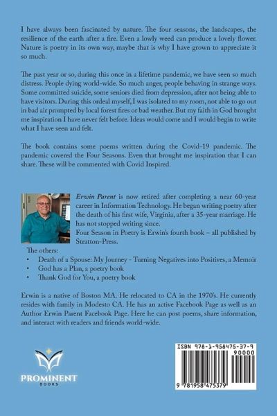 Erwin Parent is now retired after completing a near 60-year career in Information Technology. He began writing poetry after the death of his first wife, Virginia, after a 35-year marriage. He has not stopped writing since. Erwin lost two wives to Ovarian Cancer. When discovered, they were both terminal and passed away in a matter of weeks. He kept them both at home and was alone with them both in the end. He wrote this book to help others who may be grieving after losing a loved one. He writes. "My time was not spent with grief, gloom and doom but was filled with God's presence and inspiration". Erwin is a native of Boston MA. He relocated to CA in the 1970's. Erwin currently resides with family in Modesto CA. He has an active Facebook Page as well as an Author Erwin Parent Facebook Page.In addition to his books already published, he has another book in the works: The Four Seasons in Poetry - Poems of inspiration from the changing Seasons