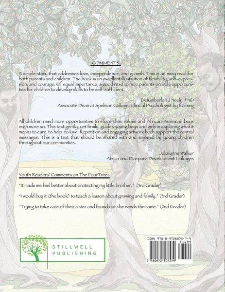 The Four Trees is a kid friendly novella that demonstrates the undeniable relationship between man and nature, with connections to Christianity. The author personifies a forest while highlighting the basic elements of life; the technique not only draws in the intended audience but also sends the reader on a journey through family strength and love, children will learn the importance of trusting one another and grownup will learn to give children room to grow by letting the sun hit their face and the water hit their leaves so they can grow strong and become trees, truly a great read for the family!
