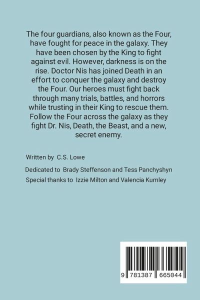 Two centuries ago, the King defeated Death on the distant planet of Kash. But the King has disappeared, leaving four guardians to defend the galaxy from impending threats. Join our four heroes as they battle fuaths, hunt villains, and face a new evil unknown to the world. This book is filled with adventures, excitement, thrill, and struggles. It resembles much of what it looks like to be a Christian in a world of darkness. When things don't go our way or when horrible events transpire, where do we as Christians look? To idols? To others? To our own strength and plans? Or do we surrender our own desires and obey God's law and stand steadfast in truth even when our world seems to be crashing all around us?