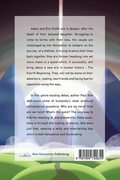 Adam and Eve Smith are in despair after the death of their beloved daughter. Struggling to come to terms with their loss, the couple are challenged by the Storyteller to embark on the journey of a lifetime. In trying to piece their lives back together they are thrown headlong into yet more chaos in a quest which, if successful, will bring about a new era in human history - The Fourth Beginning. They will not be alone on their adventure, making new friends and facing fearful opposition along the way... In this genre-busting debut, author Paul Gee addresses some of humanity's most profound philosophical questions: Why are we here? How are we here? What's the point? The only way to find the meaning of, and answers to, these questions is through the making of stories. Gee does just that, weaving a witty and entertaining tale which is both fantastical and illuminating.