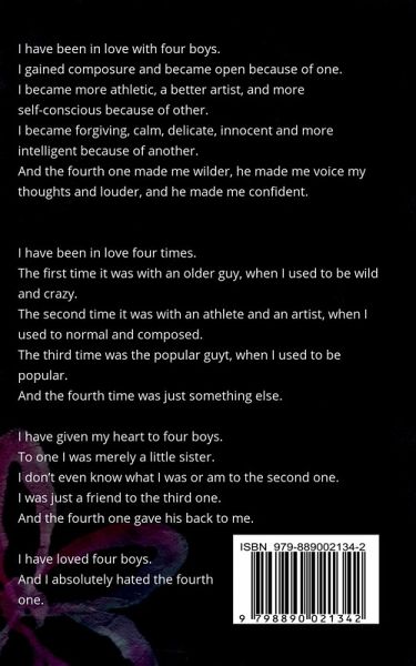 I have been in love with four boys. I gained composure and became open because of one. I became more athletic, a better artist, and more self-conscious because of other. I became forgiving, calm, delicate, innocent and more intelligent because of another. And the fourth one made me wilder, he made me voice my thoughts and louder, and he made me confident. I have been in love four times. The first time it was with an older guy, when I used to be wild and crazy. The second time it was with an athlete and an artist, when I used to normal and composed. The third time was with the popular guy, when I used to be popular. And the fourth time was just something else. I have given my heart to four boys. To one I was merely a little sister. I don't even know what I was or am to the second one. I was just a friend to the third one. And the fourth one gave his back to me. I have loved four boys. And I absolutely hated the fourth one.