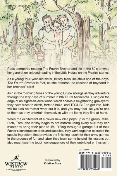 Ross compares reading The Fourth Brother and life in the 60's to what her generation enjoyed reading in the Little House on the Prairies stories. As a young four-year-old sister, Krissy feels like she's one of the boys, The Fourth Brother in fact, as she absorbs the essence of boyhood in her brothers' care! Join in the rollicking times of the young Brune siblings as they adventure through the lazy days of summer in1960 rural Minnesota. Living on the edge of an eighteen-acre wood which shares a neighboring graveyard, they have trees to climb, forts to build, and TROUBLE to get into. Kids will be kids no matter what era it is, and you may feel like you're one of them as they entertain themselves with the items they find at hand. When the excitement of a clever new idea pops up in the group, Mike, Rich, Tom, and Krissy begin to brainstorm using every skill they can muster to bring their plan to life! Rifling through a garage full of their Father's construction tools and supplies, they work together to create the special ingredient that provides the finishing touch for their army games. In the process of fun and labor they learn some helpful life lessons but also must face the tough consequences of their unbridled enthusiasm.