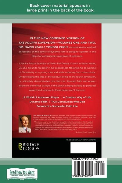 Volumes One and Two, Dr. David (Paul) Yonggi Cho's comprehensive spiritual philosophy on the power of dynamic faith is brought together in one place for completeness and ease of reference. A Senior Pastor Emeritus of Yoido Full Gospel Church in Seoul, Korea, Dr. Cho grounds his belief in his experiences following his conversion to Christianity as a young man and while suffering from tuberculosis. By developing the idea of the spiritual being as the fourth dimension, he ultimately demonstrates how this can, through faith and prayer, influence and effect change in the physical being leading to personal growth and renewal. In these pages you'll discover: â¿¢ A World of Answered Prayer â¿¢ A Creative Way of Life â¿¢ Dynamic Faith â¿¢ True Communion with God â¿¢ Secrets of a Successful Faith Life. Dr. David Yonggi Cho has also authored such best-sellers as Successful Home Cell Groups, Unleashing the Power of Faith, Solving Life's Problems, Suffering... Why Me?, A Leap of Faith, and 4th Dimensional Living in a 3 Dimensional World. ''''''''The imminence of my death had brought me to the realization that I needed something greater than a religion, greater than a philosophy, and even greater than sympathy for the trials of human existence. I needed someone who could share my struggles and sufferings, someone who could give me victory. Through reading the Bible I discovered that someone to be the Lord Jesus Christ.