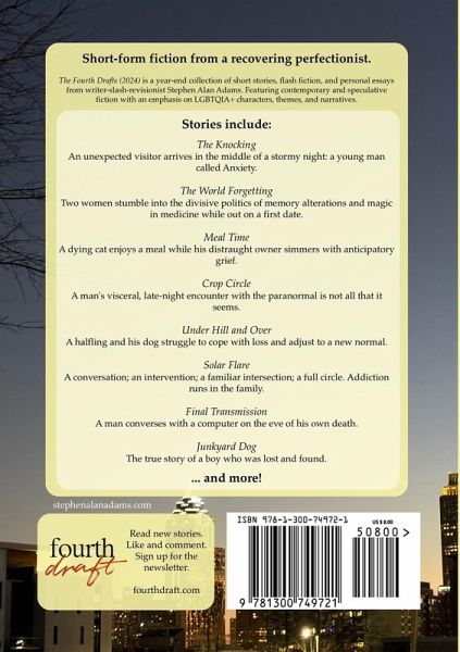Short-form fiction from a recovering perfectionist. The Fourth Drafts (2024) is a year-end collection of short stories, flash fiction, and personal essays from writer-slash-revisionist Stephen Alan Adams. Featuring contemporary and speculative fiction with an emphasis on LGBTQIA+ characters, themes, and narratives.