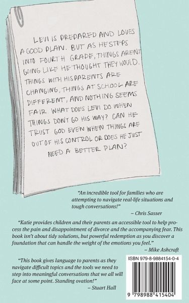 Levi is prepared and loves a good plan. But as he steps into fourth grade, things aren't going like he thought they would. Things with his parents are changing, things at school are different, and nothing seems fair. What does Levi do when things don't go his way? Can he trust God even when things are out of his control or does he just need a better plan? "Picture perfect families only exist on Social Media. Real life family life is filled with challenges and disappointments that cause real pain. In this book, you will meet Levi, an elementary school student, learning to navigate the uncertainty of his parent's divorce. Katie provides children and their parents an accessible tool to help process the pain and disappointment of divorce and the accompanying fear. This book isn't about tidy solutions, but powerful redemption as you discover a foundation that can handle the weight of the emotions you feel. And learn that when everything seems out of control, God can handle everything we feel and can be trusted." -Mike Ashcraft "Parenting is by far the most difficult responsibility any parent will ever have. None of us know what we are doing; we are all novices, always pretending to be in control... until we are not. The great theologian Mike Tyson is right: "Everyone has a plan until they get hit in the mouth." We as parents are no different. What do we do, what do we say, how do we lead and love our children, when realities like death, disease, disaster, and divorce rattle our children to the core of their being? That is why this series by my friend Katie Robinson and the Port City Community Church faith family is an invaluable gift to parents everywhere. This book give language to parents as they navigate difficult topics and the tools we need to step into meaningful conversations that we all will face at some point. Standing ovation Katie and PC3 family! -Stuart Hall s and tough conversations. It's "This book is a great resource for families who are attempting to navigate real-life situations and tough conversations. It's a tool for parents to use as they seek to lead their kids and help them see a bigger picture. The story is creative, engaging, and gives kids some practical pictures of healthy ways to work through their thoughts, feelings, and emotions as they learn how to rely on God through it all. Katie's writing helps the readers step into the story and feel what is happening. This book is a real winner when it comes to dealing with a difficult issue." -Chris Sasser
