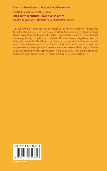 This edited volume, the third in a three-volume set, discusses implications of The Fourth Industrial Revolution (4IR) in Africa. By rebuilding natural ecosystems, linking billions to digital networks, and better managing assets, the world may be able to undo the damage done by the industrial revolutions. There are, however, significant concerns that institutions will not be able to adapt, that governments will not adopt and regulate new technologies to reap their benefits, that power shifts will result in serious new security threats, that inequality will increase, and that societies will break apart. Written by an international panel of experts, analyzes the potential of smart technology across sectors and industries in Africa to bring about long-term, sustainable growth.