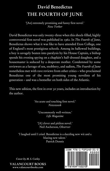 'Brilliantly clever . . . mercilessly funny.' - Kenneth Allsop, Daily Mail 'One of the most brilliantly written books since the war.' - Ian Fleming, Sunday Times '[A] clever and pitiless novel.' - Neil Ascherson, Observer '[An] extremely promising and funny first novel.' - New Yorker 'I laughed until I cried. Benedictus is a dazzling new wit and a blazing new talent.' - Patrick Dennis David Benedictus was only twenty-three when his shock-filled, highly controversial first novel was published in 1962. In The Fourth of June, Benedictus shows what it was like to have attended Eton College, one of England's most prestigious schools. Among its hallowed buildings, a boy is savagely beaten into paralysis by his House Captain, a bishop spends his evening spying on a chaplain's half-dressed daughter, and a housemaster is seduced by a desperate mother. Condemned by some reviewers as a farrago of sex, snobbery, and sadism, The Fourth of June nonetheless met with rave reviews from other critics, who proclaimed Benedictus one of the most promising new novelists of his generation, and went on to be a bestseller on both sides of the Atlantic. This new edition, the first in more than 30 years, includes an introduction by the author.