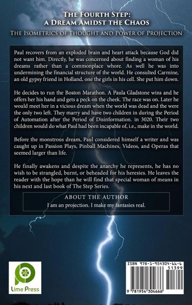 Paul recovers from an exploded brain and heart attack because God did not want him. Directly, he was concerned about finding a woman of his dreams rather than a commonplace whore. As well he was into undermining the financial structure of the world. He consulted Carmine, an old gypsy friend in Holland, one of the girls in his cell. She put him down. He decides to run the Boston Marathon. A Paula Gladstone wins and he offers her his hand and gets a peck on the cheek. The race was on. Later he would meet her in a vicious dream when the world was dead and they were the only two left. They marry and have two children during the Period of Automation after the Period of Disinformation. in 3020. Their two children would do what Paul had been incapable of, i.e., make in the world. Before the monstrous dream, Paul considered himself a writer and was caught up in Passion Plays, Pinball Machines, Videos, and Operas that seemed larger than life. He finally awakens and despite the anarchy he represents, he has no wish to be strangled, burnt, or beheaded for his heresies. He leaves the reader with the hope that he will find that special woman of means in his next and last book of The Step Series.