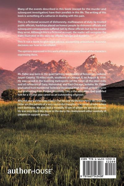 Many of the events described in this book (except for the murder and subsequent investigation) have their parallels in this life. The writing of this book is something of a catharsis in dealing with this pain. This is a fictional account of dishonesty, malfeasance of duty by trusted public officials, hardships placed on honest people by dishonest officials and subsequent consequences suffered not by those officials but by the people they serve. Although this is a fictional account, the reader will recognize the traits illustrated in this story by officials foreign and domestic. This is not a book to give legal advice, accounting procedures, business decisions nor how to run a hotel. The opinions expressed in this work of fiction are solely those of the characters expressing them.