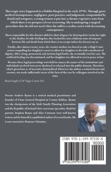 This tragic story happened in a Dublin Hospital in the early 1970's. Through gross medical incompetence, negligence, poor practice, and judgement, compounded by denial and arrogance, a young woman is put into a chronic vegetative state from which there is no prospect of ever recovering. She is undergoing a surgical procedure that she did not need when she suffers a cardiac arrest with devastating consequences. Those responsible for this disaster added to their disgrace by denying their victim her right to die. Rather, by tube feeding her, they locked her into a hideous state of suspense between life and death from which there is no escape unless the doctors say so. Finally, after almost twenty years, the victim's mother was forced to take a High Court action compelling her daughter's carers to allow her daughter to die with a modicum of dignity. After a long, protracted, and tortious legal battle, she eventually won her case. The artificial feeding was discontinued, and her daughter was allowed to rest in peace at last. Because these legal proceedings were held in camera the names of the institutions and individuals involved were never disclosed or released into the public domain. Therefore, what's given here is, of necessity, fictionalized. However, the author, a retired doctor and coroner, was made sufficiently aware of the facts of the case by colleagues involved at the time. Book length: 6"x9" Pages Count 343