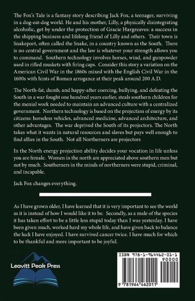 The Fox's Tale is a fantasy story describing Jack Fox, a teenager, surviving in a dog-eat-dog world. He and his mother, Lilly, a physically disintegrating alcoholic, get by under the protection of Gracie Hargreaves: a success in the shipping business and lifelong friend of Lilly and others. Their town is Snakeport, often called the Snake, in a country known as the South. There is no central government and the law is whatever your strength allows you to command. Southern technology involves horses, wind, and gunpowder used in rifled muskets with firing caps. Consider this story a variation on the American Civil War in the 1860s mixed with the English Civil War in the 1600s with hints of Roman arrogance at their peak around 200 A.D. The North-fat, dumb, and happy-after coercing, bullying, and defeating the South in a war fought one hundred years earlier, steals southern children for the menial work needed to maintain an advanced culture with a centralized government. Northern technology is based on the projection of energy by its citizens: horseless vehicles, advanced medicine, advanced architecture, and other advantages. The war deprived the South of its projectors. The North takes what it wants in natural resources and slaves but pays well enough to find allies in the South. Not all Northerners are projectors In the North energy projection ability decides your vocation in life unless you are female. Women in the north are appreciated above southern men but not by much. Southerners in the minds of northerners were stupid, criminal, and incapable. Jack Fox changes everything.