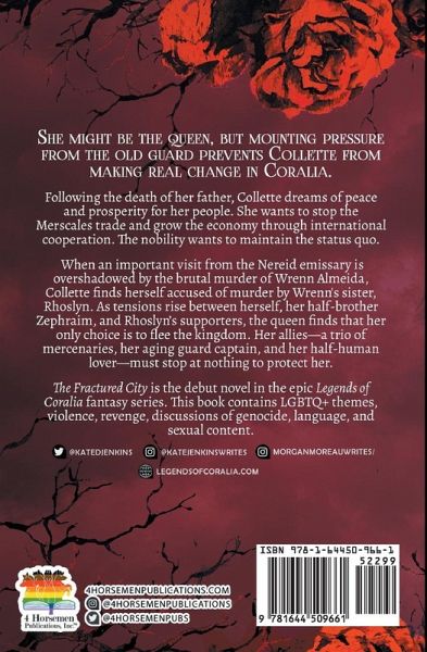 She might be the queen, but mounting pressure from the old guard prevents Collette from making real change in Coralia. Following the death of her father, Collette dreams of peace and prosperity for her people. She wants to stop the Merscales trade and grow the economy through international cooperation. The nobility wants to maintain the status quo. When an important visit from the Nereid emissary is overshadowed by the brutal murder of Wrenn Almeida, Collette finds herself accused of murder by Wrenn's sister, Rhoslyn. As tensions rise between herself, her half-brother Zephraim, and Rhoslyn's supporters, the queen finds that her only choice is to flee the kingdom. Her allies-a trio of mercenaries, her aging guard captain, and her half-human lover-must stop at nothing to protect her. The Fractured City is the debut novel in the epic Legends of Coralia fantasy series. This book contains LGBTQ+ themes, violence, revenge, discussions of genocide, language, and sexual content.