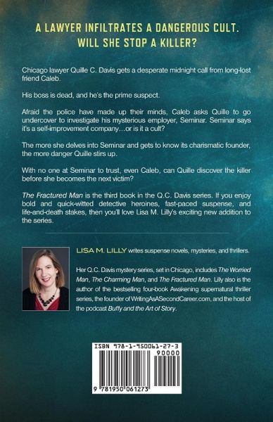 Quille’s Long-Lost Friend Begs Her To Prove His Innocence. But What If He’s A Killer? Chicago lawyer Quille C. Davis gets a desperate midnight call from long-lost friend Caleb. His boss is dead, and he’s the prime suspect. Afraid the police have made up their minds, Caleb asks Quille to go undercover to investigate his mysterious employer, Seminar. Seminar says it’s a self-improvement company…or is it a cult? The more she delves into Seminar and gets to know its charismatic founder, the more danger Quille stirs up. With no one at Seminar to trust, even Caleb, can Quille discover the killer before she becomes the next victim? The Fractured Man is the third book in the Q.C. Davis series, though each novel stands alone. If you enjoy bold and quick-witted detective heroines, fast-paced suspense, and life-and-death stakes, then you’ll love Lisa M. Lilly’s exciting new addition to the series.