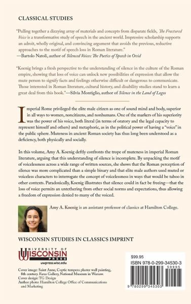 Imperial Rome privileged the elite male citizen as one of sound mind and body, superior in all ways to women, noncitizens, and nonhumans. One of the markers of his superiority was the power of his voice, both literal (in terms of oratory and the legal capacity to represent himself and others) and metaphoric, as in the political power of having a "voice" in the public sphere. Muteness in ancient Roman society has thus long been understood as a deficiency, both physically and socially. In this volume, Amy Koenig deftly confronts the trope of muteness in Imperial Roman literature, arguing that this understanding of silence is incomplete. By unpacking the motif of voicelessness across a wide range of written sources, she shows that the Roman perception of silence was more complicated than a simple binary and that elite male authors used muted or voiceless characters to interrogate the concept of voicelessness in ways that would be taboo in other contexts. Paradoxically, Koenig illustrates that silence could in fact be freeing-that the loss of voice permits an untethering from other social norms and expectations, thus allowing a freedom of expression denied to many of the voiced.