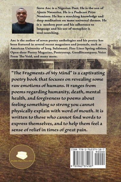 If you are looking for poetry to introduce to a thoughtful soul, a lover of poetry, kids, schools, and humans in general, it is great to start with The Fragments of my mind: the delicate lines to this place and time, by Steve Anc. It's all about hope, hopelessness, love, self-care, power, fame, war, peace, and death. It also displays the beauty of poetry as part of wordplay, and it is also important to know that the poet (Steve Anc) recognizes and explores that aspect in this anthology. The touchstone of the old and modern literature has been utilized in this anthology and its best criterion for judging it is how the poet learned the art of blending it with modern literature within these pages. An evocative journey through the labyrinth of memory and emotion, 'The Fragments of My Mind' captures the essence of human experience with poignant clarity. Each page is a mosaic of introspection and revelation, inviting readers to navigate the complexities of identity and existence. A mesmerizing exploration of the human psyche that lingers long after the final page.