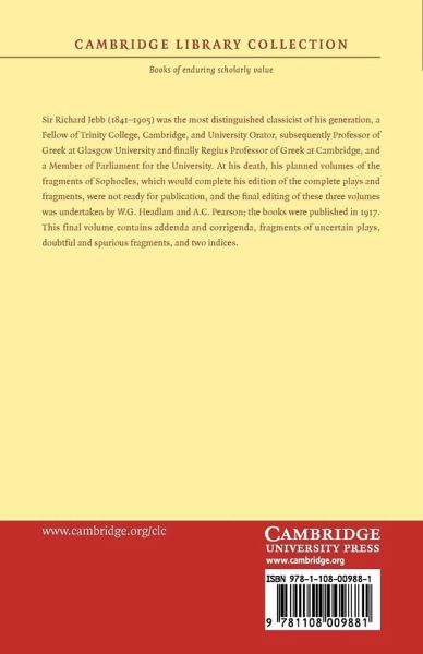 The final volume of Jebb's edition of the fragments of Sophocles, completed after his death by Headlam and Pearson.