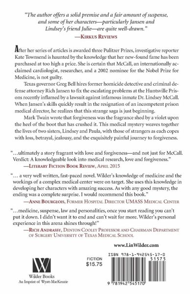 After her series of articles is awarded three Pulitzer Prizes, investigative reporter Kate Townsend is haunted by the knowledge that her new-found fame has been purchased at too high a price. She is certain that McCall, an internationally acclaimed cardiologist, researcher, and a 2002 nominee for the Nobel Prize for Medicine, is not guilty. Texas governor Greg Bell hires former homicide detective and criminal defense attorney Rich Jansen to fix the escalating problems at the Huntsville Prisons recently inflamed by a lawsuit against infamous inmate Dr. Lindsey McCall. When Jansen's skills quickly result in the resignation of an incompetent prison medical director, he realizes that this strange saga is just beginning. Mark Twain wrote that forgiveness was the fragrance shed by a violet upon the heel of the boot that has crushed it. This medical mystery weaves together the lives of two sisters, Lindsey and Paula, with those of strangers as each copes with loss, betrayal, jealousy, and the exquisitely painful journey to forgiveness.