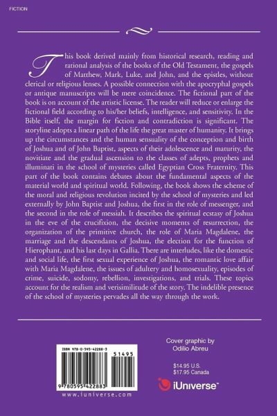 This book derived mainly from historical research, reading and rational analysis of the books of the Old Testament, the gospels of Matthew, Mark, Luke, and John, and the epistles, without clerical or religious lenses. A possible connection with the apocryphal gospels or antique manuscripts will be mere coincidence. The fictional part of the book is on account of the artistic license. The reader will reduce or enlarge the fictional field according to his/her beliefs, intelligence, and sensitivity. In the Bible itself, the margin for fiction and contradiction is significant. The storyline adopts a linear path of the life the great master of humanity. It brings up the circumstances and the human sensuality of the conception and birth of Joshua and of John Baptist, aspects of their adolescence and maturity, the novitiate and the gradual ascension to the classes of adepts, prophets and illuminati in the school of mysteries called Egyptian Cross Fraternity. This part of the book contains debates about the fundamental aspects of the material world and spiritual world. Following, the book shows the scheme of the moral and religious revolution incited by the school of mysteries and led externally by John Baptist and Joshua, the first in the role of messenger, and the second in the role of messiah. It describes the spiritual ecstasy of Joshua in the eve of the crucifixion, the decisive moments of resurrection, the organization of the primitive church, the role of Maria Magdalene, the marriage and the descendants of Joshua, the election for the function of Hierophant, and his last days in Gallia. There are interludes, like the domestic and social life, the first sexual experience of Joshua, the romantic love affair with Maria Magdalene, the issues of adultery and homosexuality, episodes of crime, suicide, sodomy, rebellion, investigations, and trials. These topics account for the realism and verisimilitude of the story. The indelible presence of the school of mysteries pervades all the way through the work.