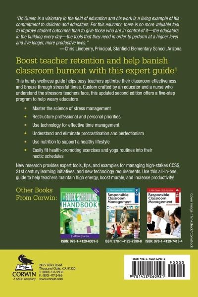 Boost teacher retention and help banish classroom burnout with this expert guide! This handy wellness guide helps busy teachers optimize their classroom effectiveness and breeze through stressful times. Custom crafted by an educator and a nurse who understand the stresses teachers face, this updated second edition offers a five-step program to help weary educators: Master the science of stress management Restructure professional and personal priorities Use technology for time management Easily fit health-promoting nutrition and exercise routines into their day New research and expert tips address high-stakes CCSS, 21st Century Learning initiatives, and technology requirements.