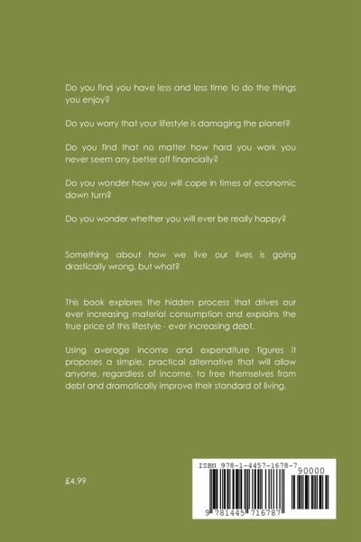 Do you find you have less and less time to do the things you enjoy? Do you worry that your lifestyle is damaging the planet? Do you find that no matter how hard you work you never seem any better off financially? Do you wonder how you will cope in times of economic down turn? Do you wonder whether you will ever be really happy? Something about how we live our lives is going drastically wrong, but what? This book explores the hidden process that drives our ever increasing material consumption and explains the true price of this lifestyle - ever increasing debt. Using average income and expenditure figures it proposes a simple, practical alternative that will allow anyone, regardless of income, to free themselves from debt and dramatically improve their standard of living.