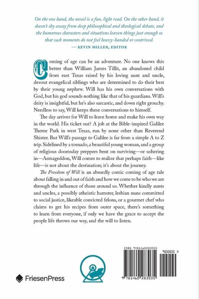 Coming of age can be an adventure. No one knows this better than William James Tillit, an abandoned child from east Texas raised by his loving aunt and uncle, devout evangelical siblings who are determined to do their best by their young nephew. Will has his own conversations with God, but his god sounds nothing like that of his guardians. Will's deity is insightful, but he's also sarcastic, and down right grouchy. Needless to say, Will keeps these conversations to himself. The day arrives for Will to leave home and make his own way in the world. His ticket out? A job at the Bible-inspired Galilee Theme Park in west Texas, run by none other than Reverend Shister. But Will's passage to Galilee is far from a simple A to Z trip. Sidelined by a tornado, a beautiful young woman, and a group of religious doomsday preppers bent on surviving-or ushering in-Armageddon, Will comes to realize that perhaps faith-like life-is not about the destination; it's about the journey. The Freedom of Will is an absurdly comic coming of age tale about falling in and out of faith and how we come to be who we are through the influence of those around us. Whether kindly aunts and uncles, a possibly atheistic hamster, lesbian nuns committed to social justice, likeable convicted felons, or a gourmet chef who claims to get his recipes from outer space, there's something to learn from everyone, if only we have the grace to accept the people life throws our way, and the will to listen.