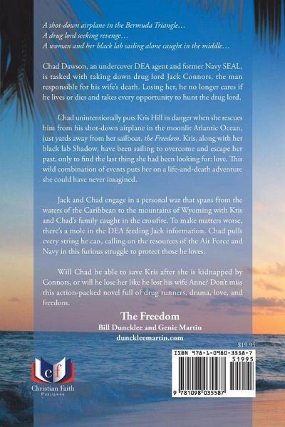 A shot-down airplane in the Bermuda Triangle... A drug lord seeking revenge... A woman and her black lab sailing alone caught in the middle... Chad Dawson, an undercover DEA agent and former Navy SEAL, is tasked with taking down drug lord Jack Connors, the man responsible for his wife's death. Losing her, he no longer cares if he lives or dies and takes every opportunity to hunt the drug lord. Chad unintentionally puts Kris Hill in danger when she rescues him from his shot-down airplane in the moonlit Atlantic Ocean, just yards away from her sailboat, the Freedom. Kris, along with her black lab Shadow, have been sailing to overcome and escape her past, only to find the last thing she had been looking for: love. This wild combination of events puts her on a life-and-death adventure she could have never imagined. Jack and Chad engage in a personal war that spans from the waters of the Caribbean to the mountains of Wyoming with Kris and Chad's family caught in the crossfire. To make matters worse, there's a mole in the DEA feeding Jack information. Chad pulls every string he can, calling on the resources of the Air Force and Navy in this furious struggle to protect those he loves. Will Chad be able to save Kris after she is kidnapped by Connors, or will he lose her like he lost his wife Anne? Don't miss this action packed-novel full of drug runners, drama, love, and freedom. The Freedom Bill Duncklee and Genie Martin dunckleemartin.com
