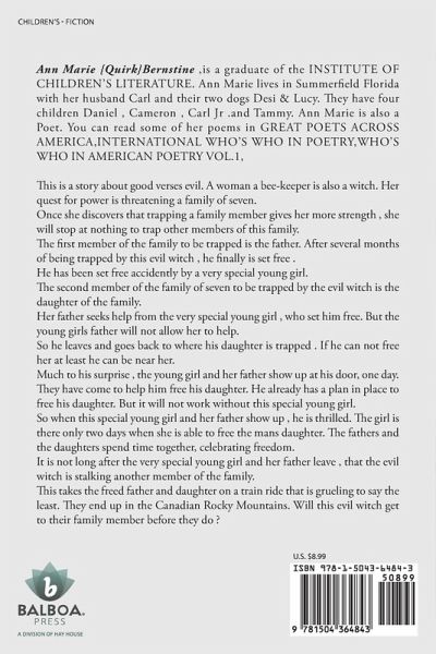 This is a story about good verses evil. A woman a bee-keeper is also a witch. Her quest for power is threatening a family of seven. Once she discovers that trapping a family member gives her more strength , she will stop at nothing to trap other members of this family. The first member of the family to be trapped is the father. After several months of being trapped by this evil witch , he finally is set free . He has been set free accidently by a very special young girl. The second member of the family of seven to be trapped by the evil witch is the daughter of the family. Her father seeks help from the very special young girl , who set him free. But the young girls father will not allow her to help. So he leaves and goes back to where his daughter is trapped . If he can not free her at least he can be near her. Much to his surprise , the young girl and her father show up at his door, one day. They have come to help him free his daughter. He already has a plan in place to free his daughter. But it will not work without this special young girl. So when this special young girl and her father show up , he is thrilled. The girl is there only two days when she is able to free the mans daughter. The fathers and the daughters spend time together, celebrating freedom. It is not long after the very special young girl and her father leave , that the evil witch is stalking another member of the family. This takes the freed father and daughter on a train ride that is grueling to say the least. They end up in the Canadian Rocky Mountains. Will this evil witch get to their family member before they do ?