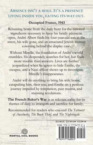 ABSENCE ISN'T A HOLE. IT'S A PRESENCE LIVING INSIDE YOU, EATING ITS WAY OUT. Occupied France, 1943. Returning home from the daily hunt for the rationed ingredients necessary to keep his family pâtisserie open, André Albert finds his four-year-old son in the street, his wife gone, and an emaciated Jewish woman cowering behind the display case. Without Mireille, the foundation of André's world crumbles. He desperately searches for her, but finds more trouble than answers. Lives are further jeopardized when he agrees to hide Émilie, the escapee, and a Nazi officer shows up to investigate Mireille's disappearance. André will do anything to bring his wife home, catapulting him, their son, and Émilie on a perilous journey impeded by temptation, past trauma, and stunning revelations. The French Baker's War is as relevant today for its themes of duty to strangers and sacrifice for family. Recommended for readers who enjoyed The Tattooist of Auschwitz, The Book Thief, and The Nightingale.
