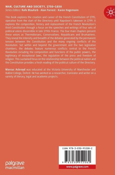 This book explores the creation and career of the French Constitution of 1795, operative from the start of the Directory until Napoleon's takeover in 1799. It explores the composition, history and replacement of the French Revolution's third Constitution through a focus on the speeches and writings of four sets of political voices discernible in late 1790s France. The four main chapters present these voices as Thermidorians, Conservatives, Republicans and Brumairiens. They reveal the intensity and breadth of the debates generated by the permanent tension between the Constitution and the many ongoing conflicts of the Revolution. Set within and beyond the government and the two legislative chambers, the debates feature numerous conflicts central to the French Revolution including the composition and functions of the public powers, the legitimacy of exceptional laws, the regulation of the press and freedom of religion. This sustained focus on the relationship between the politicalnation and the Constitution provides a fresh reading of the political culture of the Directory.