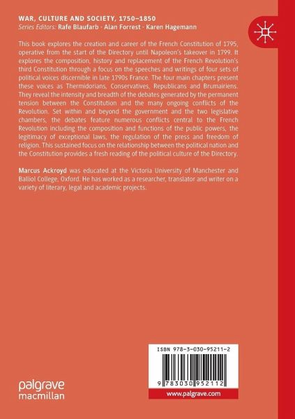 This book explores the creation and career of the French Constitution of 1795, operative from the start of the Directory until Napoleon's takeover in 1799. It explores the composition, history and replacement of the French Revolution's third Constitution through a focus on the speeches and writings of four sets of political voices discernible in late 1790s France. The four main chapters present these voices as Thermidorians, Conservatives, Republicans and Brumairiens. They reveal the intensity and breadth of the debates generated by the permanent tension between the Constitution and the many ongoing conflicts of the Revolution. Set within and beyond the government and the two legislative chambers, the debates feature numerous conflicts central to the French Revolution including the composition and functions of the public powers, the legitimacy of exceptional laws, the regulation of the press and freedom of religion. This sustained focus on the relationship between the politicalnation and the Constitution provides a fresh reading of the political culture of the Directory.