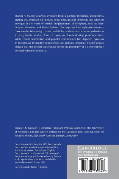 Sharon A. Stanley analyzes cynicism from a political-theoretical perspective, arguing that cynicism isn't unique to our time. Instead, she posits that cynicism emerged in the works of French Enlightenment philosophers, such as Jean-Jacques Rousseau and Denis Diderot. She explains how eighteenth-century theories of epistemology, nature, sociability and commerce converged to form a recognizably modern form of cynicism, foreshadowing postmodernism. While recent scholarship and popular commentary have depicted cynicism as threatening to healthy democracies and political practices, Stanley argues instead that the French philosophes reveal the possibility of a democratically hospitable form of cynicism.
