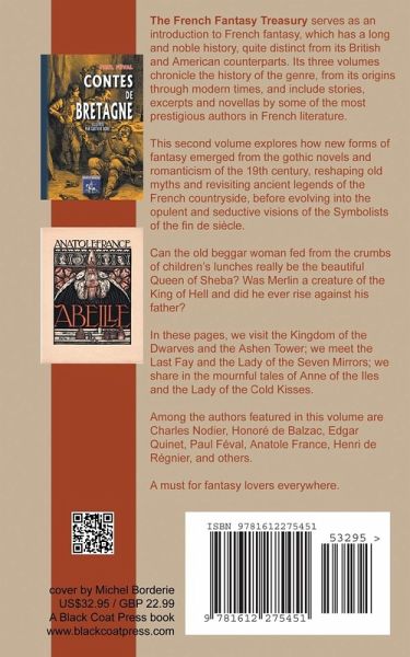 The French Fantasy Treasury serves as an introduction to French fantasy, which has a long and noble history, quite distinct from its British and American counterparts. Its three volumes chronicle the history of the genre, from its origins through modern times, and include stories, excerpts and novellas by some of the most prestigious authors in French literature. A must for fantasy lovers everywhere. This second volume explores how new forms of fantasy emerged from the gothic novels and romanticism of the 19th century, reshaping old myths and revisiting ancient legends of the French countryside, before evolving into the opulent and seductive visions of the Symbolists of the fin de siècle. Can the old beggar woman fed from the crumbs of children's lunches really be the beautiful Queen of Sheba? Was Merlin a creature of the King of Hell and did he ever rise against his father? In these pages, we visit the Kingdom of the Dwarves and the Ashen Tower; we meet the Last Fay and the Lady of the Seven Mirrors; we share in the mournful tales of Anne of the Iles and the Lady of the Cold Kisses.