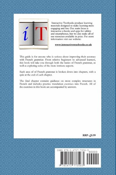 This guide is for anyone who is serious about improving their accuracy with French grammar. From relative beginners to advanced learners, this book will take you through both the basics of French grammar, as well as exploring some of the more intricate aspects. Each area of of French grammar is broken down into chapters, with a quiz at the end of each chapter. The final chapter contains guidance on more complex structures in French and includes practice translation exercises into French. All of the exercises in this book are accompanied by answers.