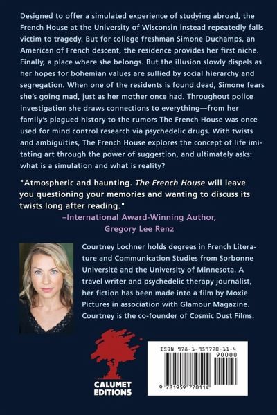 Designed to offer a simulated experience of studying abroad, the French House at the University of Wisconsin instead repeatedly falls victim to tragedy. But for college freshman Simone Duchamps, an American of French descent, the residence provides her first niche. Finally, a place where she belongs. But the illusion slowly dispels as her hopes for bohemian values are sullied by social hierarchy and segregation. When one of the residents is found dead, Simone fears she's going mad, just as her mother once had. Throughout police investigation she draws connections to everything-from her family's plagued history to the rumors The French House was once used for mind control research via psychedelic drugs. With twists and ambiguities, The French House explores the concept of life imitating art through the power of suggestion, and ultimately asks: what is a simulation and what is reality ""Atmospheric and haunting. The French House will leave you questioning your memories and wanting to discuss its twists long after reading."" -International Award-Winning Author, Gregory Lee Renz ""Spellbinding. This novel is an important thesis on segregation, mind control, and our existential need to fit in. An absolutely stunning debut.""-Jean-Christophe Born, French film and opera star