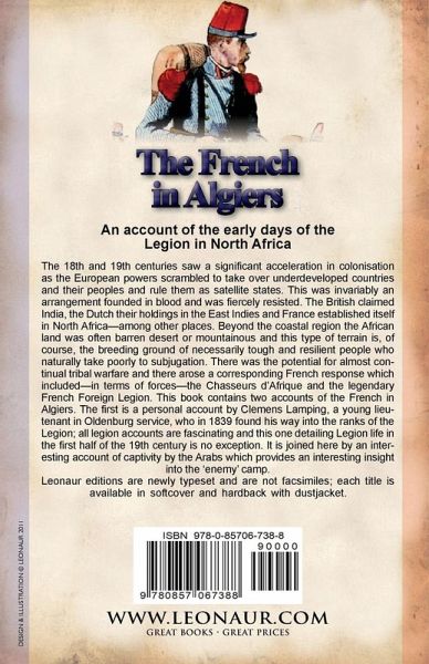 An account of the early days of the Legion in North Africa The 18th and 19th centuries saw a significant acceleration in colonisation as the European powers scrambled to take over underdeveloped countries and their peoples and rule them as satellite states. This was invariably an arrangement founded in blood and was fiercely resisted. The British claimed India, the Dutch their holdings in the East Indies and France established itself in North Africa-among other places. Beyond the coastal region the African land was often barren desert or mountainous and this type of terrain is, of course, the breeding ground of necessarily tough and resilient people who naturally take poorly to subjugation. There was the potential for almost continual tribal warfare and there arose a corresponding French response which included-in terms of forces-the Chasseurs d'Afrique and the legendary French Foreign Legion. This book contains two accounts of the French in Algiers. The first is a personal account by Clemens Lamping, a young lieutenant in Oldenburg service, who in 1839 found his way into the ranks of the Legion; all legion accounts are fascinating and this one detailing Legion life in the first half of the 19th century is no exception. It is joined here by an interesting account of captivity by the Arabs which provides an interesting insight into the 'enemy' camp. Leonaur editions are newly typeset and are not facsimiles; each title is available in softcover and hardback with dustjacket.