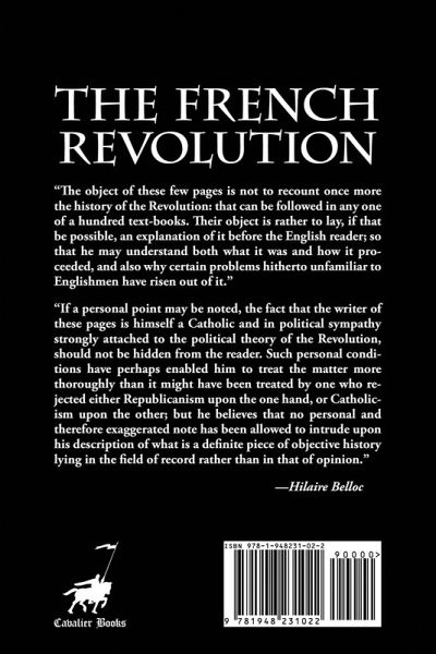 "The object of these few pages is not to recount once more the history of the Revolution: that can be followed in any one of a hundred text-books. Their object is rather to lay, if that be possible, an explanation of it before the English reader; so that he may understand both what it was and how it proceeded, and also why certain problems hitherto unfamiliar to Englishmen have risen out of it." "If a personal point may be noted, the fact that the writer of these pages is himself a Catholic and in political sympathy strongly attached to the political theory of the Revolution, should not be hidden from the reader. Such personal conditions have perhaps enabled him to treat the matter more thoroughly than it might have been treated by one who rejected either Republicanism upon the one hand, or Catholicism upon the other; but he believes that no personal and therefore exaggerated note has been allowed to intrude upon his description of what is a definite piece of objective history lying in the field of record rather than in that of opinion." —Hilaire Belloc