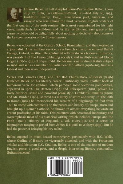 Hilaire Belloc, in full Joseph-Hilaire-Pierre-René Belloc, (born July 27, 1870, La Celle-Saint-Cloud, Fr.—died July 16, 1953, Guildford, Surrey, Eng.), French-born poet, historian, and essayist who was among the most versatile English writers of the first quarter of the 20th century. He is most remembered for his light verse, particularly for children, and for the lucidity and easy grace of his essays, which could be delightfully about nothing or decisively about some of the key controversies of the Edwardian era. Belloc was educated at the Oratory School, Birmingham, and then worked as a journalist. After military service, as a French citizen, he entered Balliol College, Oxford, in 1894. He graduated with first-class honours in history, was president of the Union (debating society), and in 1896 married Elodie Hogan (1870–1914) of Napa, Calif. He became a naturalized British subject in 1902 and sat as a member of Parliament for Salford (1906–10), first as a Liberal and then as an Independent. Verses and Sonnets (1895) and The Bad Child’s Book of Beasts (1896) launched Belloc on his literary career. Cautionary Tales, another book of humorous verse for children, which parodied some Victorian pomposities, appeared in 1907. His Danton (1899) and Robespierre (1901) proved his lively historical sense and powerful prose style. Lambkin’s Remains (1900) and Mr. Burden (1904) showed his mastery of satire and irony. In The Path to Rome (1902) he interspersed his account of a pilgrimage on foot from Toul to Rome with comments on the nature and history of Europe. Born and brought up a Roman Catholic, he showed in almost everything he wrote an ardent profession of his faith. This coloured with occasional inaccuracy and overemphasis most of his historical writing, which includes Europe and the Faith (1920), History of England, 4 vol. (1925–31), and a series of biographies ranging in period from James II (1928) to Wolsey (1930). But he had the power of bringing history to life. Belloc engaged in much heated controversy, particularly with H.G. Wells, whose Outline of History he vigorously attacked, and with the Protestant scholar and historian G.C. Coulton. Belloc is one of the masters of modern English prose, a good poet, and a deeply interesting literary personality. (britannica.com)