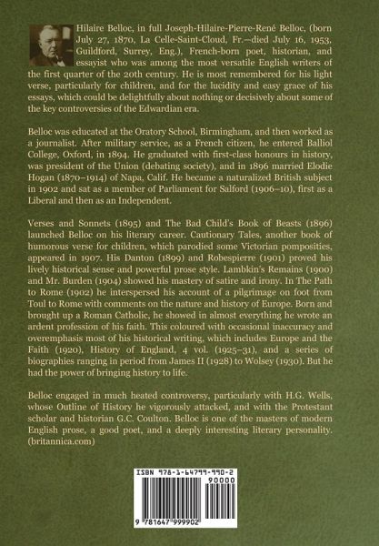 Hilaire Belloc, in full Joseph-Hilaire-Pierre-René Belloc, (born July 27, 1870, La Celle-Saint-Cloud, Fr.--died July 16, 1953, Guildford, Surrey, Eng.), French-born poet, historian, and essayist who was among the most versatile English writers of the first quarter of the 20th century. He is most remembered for his light verse, particularly for children, and for the lucidity and easy grace of his essays, which could be delightfully about nothing or decisively about some of the key controversies of the Edwardian era. Belloc was educated at the Oratory School, Birmingham, and then worked as a journalist. After military service, as a French citizen, he entered Balliol College, Oxford, in 1894. He graduated with first-class honours in history, was president of the Union (debating society), and in 1896 married Elodie Hogan (1870-1914) of Napa, Calif. He became a naturalized British subject in 1902 and sat as a member of Parliament for Salford (1906-10), first as a Liberal and then as an Independent. Verses and Sonnets (1895) and The Bad Child's Book of Beasts (1896) launched Belloc on his literary career. Cautionary Tales, another book of humorous verse for children, which parodied some Victorian pomposities, appeared in 1907. His Danton (1899) and Robespierre (1901) proved his lively historical sense and powerful prose style. Lambkin's Remains (1900) and Mr. Burden (1904) showed his mastery of satire and irony. In The Path to Rome (1902) he interspersed his account of a pilgrimage on foot from Toul to Rome with comments on the nature and history of Europe. Born and brought up a Roman Catholic, he showed in almost everything he wrote an ardent profession of his faith. This coloured with occasional inaccuracy and overemphasis most of his historical writing, which includes Europe and the Faith (1920), History of England, 4 vol. (1925-31), and a series of biographies ranging in period from James II (1928) to Wolsey (1930). But he had the power of bringing history to life. Belloc engaged in much heated controversy, particularly with H.G. Wells, whose Outline of History he vigorously attacked, and with the Protestant scholar and historian G.C. Coulton. Belloc is one of the masters of modern English prose, a good poet, and a deeply interesting literary personality. (britannica.com)