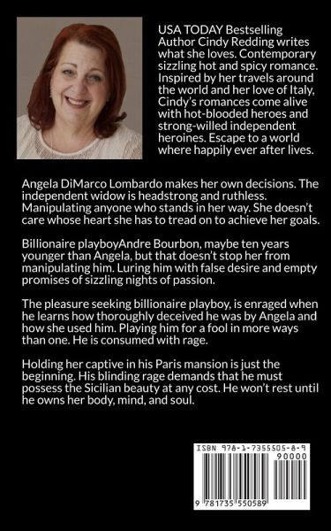 One ruthless woman and one pleasure seeking man blur the lines between lust, love, decency and revenge. A Steamy Billionaire Romance from USA Today Bestselling Author Cindy Redding. Angela DiMarco Lombardo makes her own decisions. The independent widow is headstrong and ruthless. Manipulating anyone who stands in her way. She doesn't care whose heart she has to tread on to achieve her goals. Billionaire playboyAndre Bourbon, maybe ten years younger than Angela, but that doesn't stop her from manipulating him. Luring him with false desire and empty promises of sizzling nights of passion. The pleasure seeking billionaire playboy, is enraged when he learns how thoroughly deceived he was by Angela and how she used him. Playing him for a fool in more ways than one. He is consumed with rage. Holding her captive in his Paris mansion is just the beginning. His blinding rage demands that he must possess the Sicilian beauty at any cost. He won't rest until he owns her body, mind, and soul.