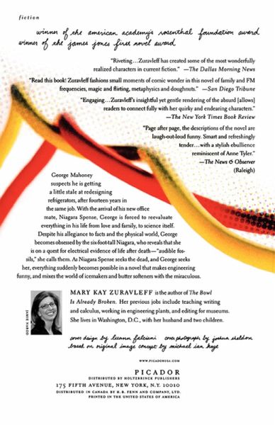 George Mahoney suspects he is getting a little stale at redesigning refrigerators, after fourteen years in the same job. With the arrival of his new office mate, Niagara Spense, George is forced to re-evaluate everything in his life from love and family, to science itself. Obsessed by the six feet tall Niagara, the very foundations of George's belief in facts and the physical world are shaken when she reveals that she is on an incredible quest for electrical evidence of life after death-"audible fossils" she calls them. As Niagara Spense seeks the dead, and George seeks her, everything suddenly becomes possible in a novel that makes engineering funny, and mixes the world of icemakers and buttersofteners with the miraculous.