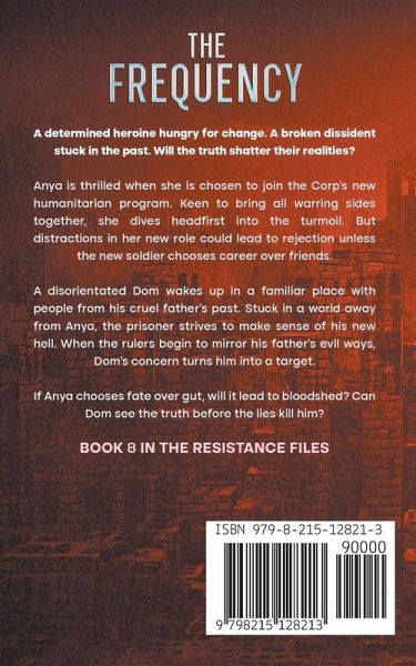 A determined heroine hungry for change. A broken dissident stuck in the past. Will the truth shatter their realities? Anya is thrilled when she is chosen to join the Corp's new humanitarian program. Keen to bring all warring sides together, she dives headfirst into the turmoil. But distractions in her new role could lead to rejection unless the new soldier chooses career over friends. A disorientated Dom wakes up in a familiar place with people from his cruel father's past. Stuck in a world away from Anya, the prisoner strives to make sense of his new hell. When the rulers begin to mirror his father's evil ways, Dom's concern turns him into a target. If Anya chooses fate over gut, will it lead to bloodshed? Can Dom see the truth before the lies kill him? Grab your copy of The Frequency, book 8 in The Resistance Files.