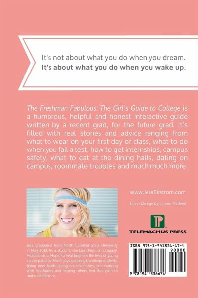 The Freshman Fabulous: The Girl's Guide to College is a humorous, helpful and honest interactive guide written by a recent grad, for the future grad. As a college student, Jess secured an internship all four years with companies like Disney World, Make-A-Wish and the TODAY Show. She gave campus tours every Tuesday and taught fitness classes every Monday, Wednesday and Friday. She played intramural coed flag football and got a stage three concussion. As a sophomore, she made it on CNN running the Krispy Kreme Challenge (eating a dozen donuts and then running 5 miles). Her junior year, she ended up starting my own company, Headbands of Hope, which gives headbands to children with cancer. By the time she graduated in May 2013, it was her full-time job and in over 100 stores in the US and Canada. Being fresh out of college, Jess decided to put all of her tips and tricks (and mistakes) into a guide to help others who are about to embark on their college journey. The Freshman Fabulous: The Girl's Guide to College isn't filled with statistics and studies about college. It's filled with real and honest stories and advice from Ekstrom as well as other anecdotes from female grads. Topics range from what to wear on your first day of class, what to do if you fail a test, how to land internships, studying abroad, what to eat (and what not to eat) at the dining halls, dating, what to do when you have roommate troubles, joining clubs, picking electives and important topics like safety on campus and alcohol. One of the most unique parts about this book is the interactive opportunity. Readers will be encouraged to map out their own college career and goals along the way by using helpful guides. This book isn't a "how to book" to live a college experience like Jess did. But rather, a compilation of lessons learned in college. Through this book, readers will be able to use her stories as a foundation to map out their own college journey.
