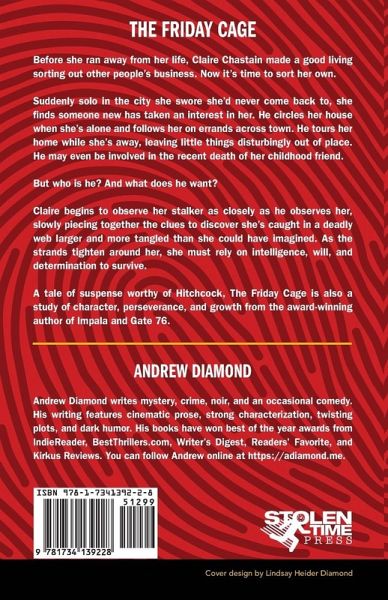 Someone new has taken an interest in Claire Chastain. He circles her house when she's alone and follows her on errands across town. He tours her home while she's away, leaving little things disturbingly out of place. He may even be involved in the recent death of her childhood friend. But who is he? And what does he want? Claire soon discovers that, like Cary Grant in North by Northwest, she's caught up in someone else's dark conspiracy, and she has no choice but to play the game. The only exit from her troubles will be the one she makes, if she's smart enough to figure out when and how to make it. A suspenseful crime thriller in the tradition of Hitchcock and Ross MacDonald, The Friday Cage features an exceptionally tough, sharp-minded protagonist who must do some soul-searching in the midst of her quest to survive.