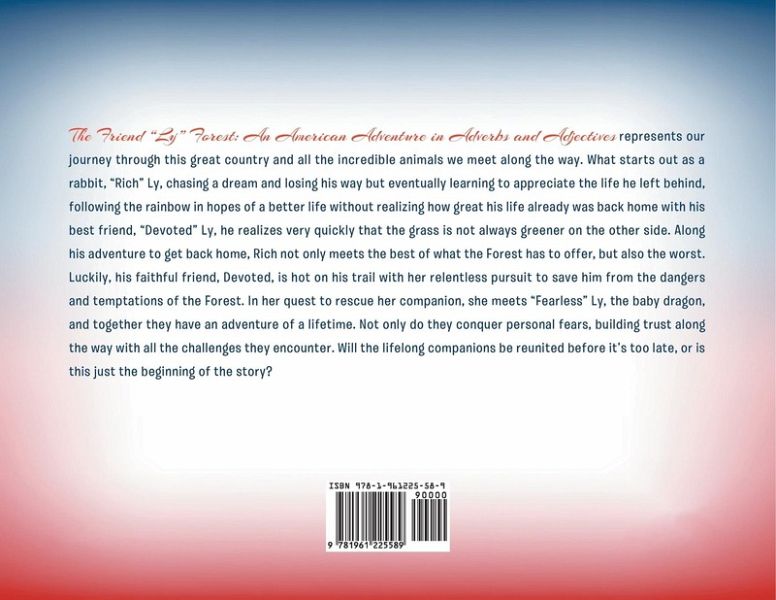 The Friend "Ly" Forest: An American Adventure in Adverbs and Adjectives represents our journey through this great country and all the incredible animals we meet along the way. What starts out as a rabbit, "Rich" Ly, chasing a dream and losing his way but eventually learning to appreciate the life he left behind, following the rainbow in hopes of a better life without realizing how great his life already was back home with his best friend, "Devoted" Ly, he realizes very quickly that the grass is not always greener on the other side. Along his adventure to get back home, Rich not only meets the best of what the Forest has to offer, but also the worst. Luckily, his faithful friend, Devoted, is hot on his trail with her relentless pursuit to save him from the dangers and temptations of the Forest. In her quest to rescue her companion, she meets "Fearless" Ly, the baby dragon, and together they have an adventure of a lifetime. Not only do they conquer personal fears, building trust along the way with all the challenges they encounter. Will the lifelong companions be reunited before it's too late, or is this just the beginning of the story?