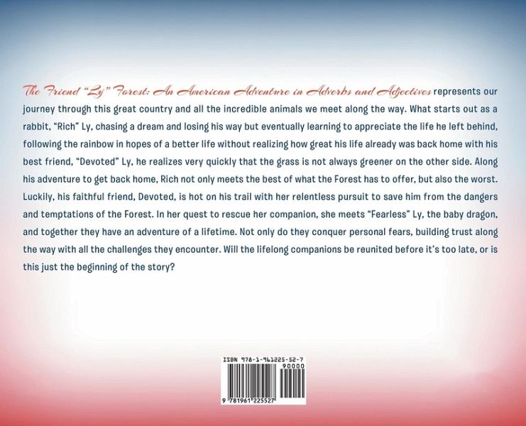 The Friend "Ly" Forest: An American Adventure in Adverbs and Adjectives represents our journey through this great country and all the incredible animals we meet along the way. What starts out as a rabbit, "Rich" Ly, chasing a dream and losing his way but eventually learning to appreciate the life he left behind, following the rainbow in hopes of a better life without realizing how great his life already was back home with his best friend, "Devoted" Ly, he realizes very quickly that the grass is not always greener on the other side. Along his adventure to get back home, Rich not only meets the best of what the Forest has to offer, but also the worst. Luckily, his faithful friend, Devoted, is hot on his trail with her relentless pursuit to save him from the dangers and temptations of the Forest. In her quest to rescue her companion, she meets "Fearless" Ly, the baby dragon, and together they have an adventure of a lifetime. Not only do they conquer personal fears, building trust along the way with all the challenges they encounter. Will the lifelong companions be reunited before it's too late, or is this just the beginning of the story?