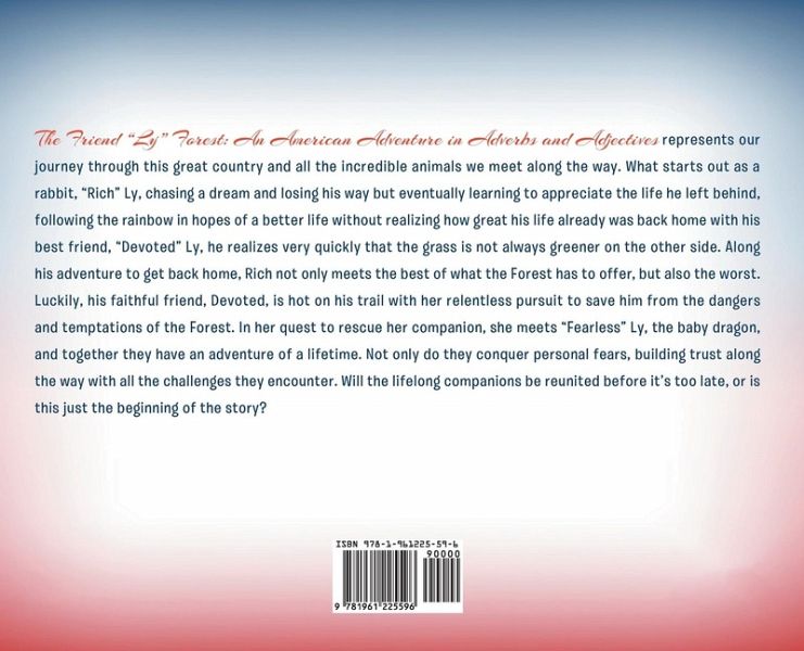The Friend "Ly" Forest: An American Adventure in Adverbs and Adjectives represents our journey through this great country and all the incredible animals we meet along the way. What starts out as a rabbit, "Rich" Ly, chasing a dream and losing his way but eventually learning to appreciate the life he left behind, following the rainbow in hopes of a better life without realizing how great his life already was back home with his best friend, "Devoted" Ly, he realizes very quickly that the grass is not always greener on the other side. Along his adventure to get back home, Rich not only meets the best of what the Forest has to offer, but also the worst. Luckily, his faithful friend, Devoted, is hot on his trail with her relentless pursuit to save him from the dangers and temptations of the Forest. In her quest to rescue her companion, she meets "Fearless" Ly, the baby dragon, and together they have an adventure of a lifetime. Not only do they conquer personal fears, building trust along the way with all the challenges they encounter. Will the lifelong companions be reunited before it's too late, or is this just the beginning of the story?